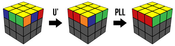 Đầu tiên, bạn xoay tầng trên cùng U (hay lớp màu vàng) để mặt trên khớp với một trong 21 trường hợp. Sau đó áp dụng công thức PLL phù hợp là được.