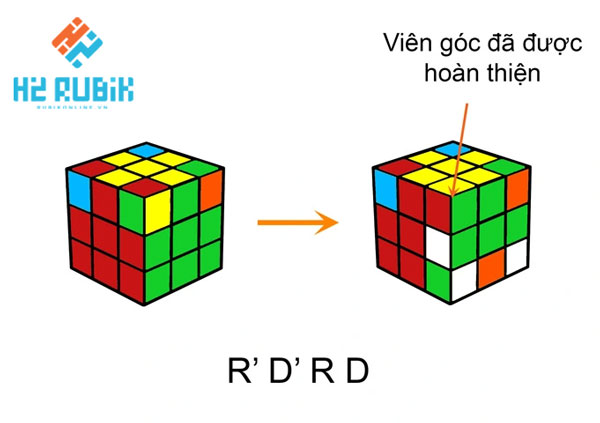 Khi đã xong được một góc, bạn hãy xoay tầng trên cùng (U hoặc U') để di chuyển một viên góc chưa được hoàn thiện về vị trí trước-phải trên và lặp lại công thức R’ D’ R D nhiều lần. Cứ làm như vậy là bạn sẽ hoàn thành khối Rubik.