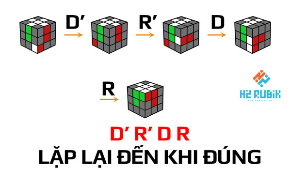 Sau đó, thực hiện thuật toán: D' R' D R . Lặp lại thuật toán trên cho đến khi góc trắng đã vào đúng vị trí và đúng trạng thái màu trắng quay lên trên.