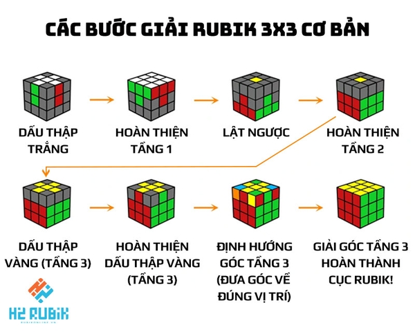 Có nhiều cách tiếp cận để giải một khối Rubik 3x3 với mức độ khó khác nhau, nhưng nhìn chung, mọi người đều công nhận rằng phương pháp dưới đây là dễ học nhất. Trong bài viết này, H2 Rubik Shop sẽ chỉ cho bạn cách để giải khối Rubik bằng phương pháp layer-by-layer 7 bước dành cho người mới bắt đầu.