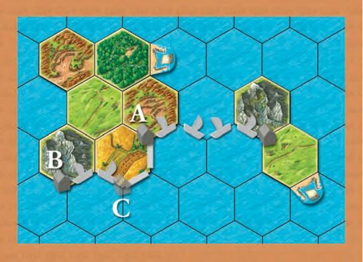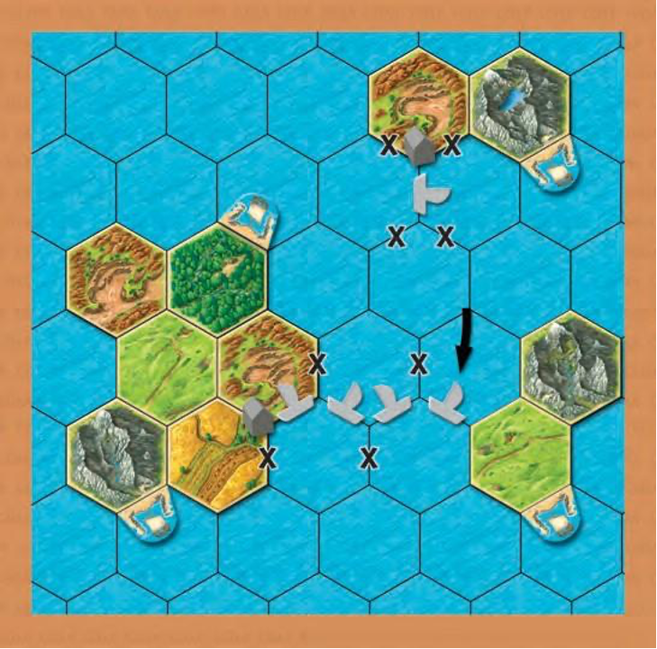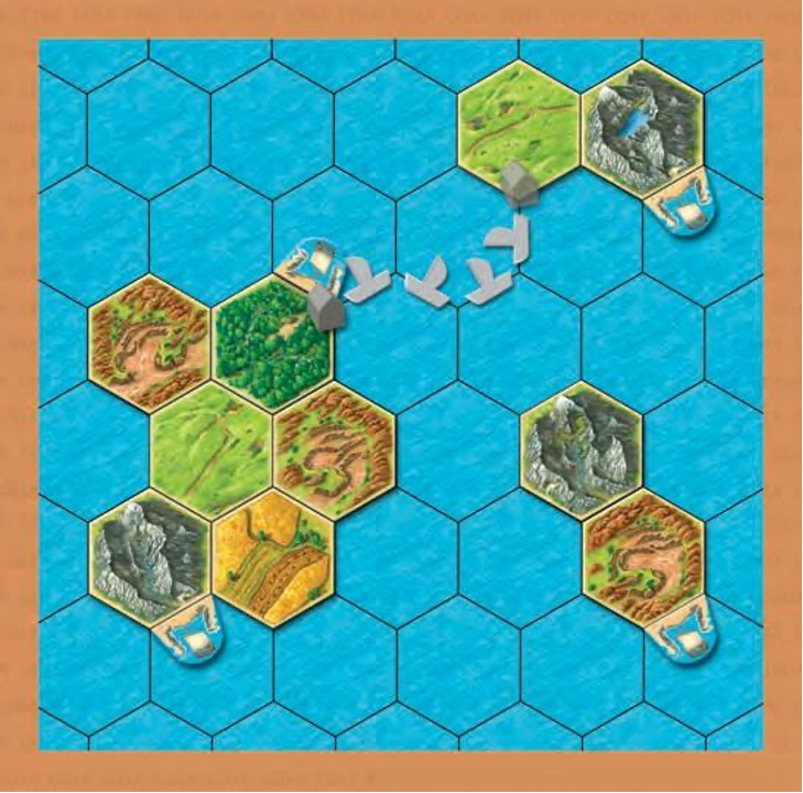 Đường và tàu có thể không được xây dựng dọc theo cùng một đường bờ biển. Chỉ có thể có một con tàu HOẶC một con đường dọc theo bất kỳ cạnh lục giác ven biển nhất định nào (xem các quy tắc của Người định cư về xây dựng đường bộ).