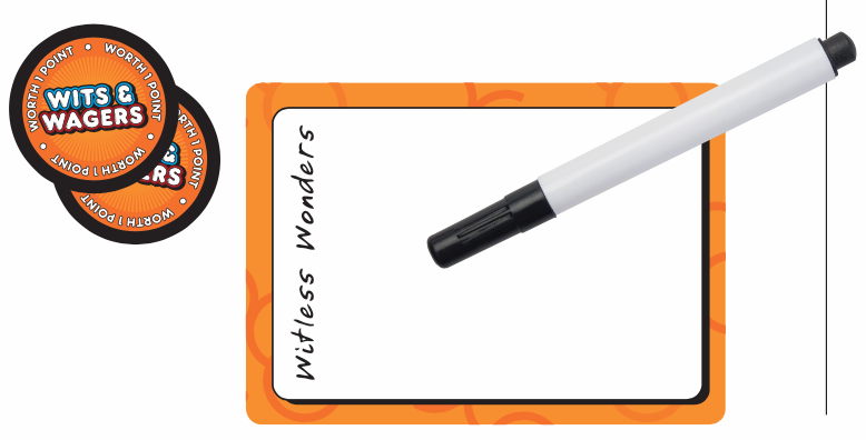 + Để chơi Wits & Wagers, mỗi người chơi (hoặc đội) chuẩn bị 1 Bút xóa, 1 Thẻ trả lời và 2 Thẻ cá cược bằng bìa cứng cùng màu với Thẻ trả lời của họ. Hãy cho mỗi người chơi khăn giấy để xóa Thẻ trả lời của họ giữa các câu hỏi.