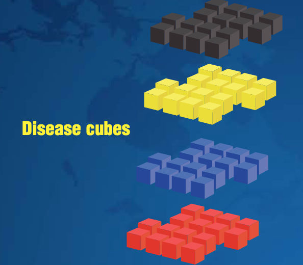 2. Lây nhiễm: rút lá bài cuối cùng cọc Lây nhiễm. Trừ khi màu dịch bệnh đã bị diệt trừ, đặt 3 khối màu bệnh đó vào thành phố tương ứng. Nếu thành phố đã có khối màu đó, không cần đặt thêm 3 khối nữa. Thay vào đó, đặt thêm khối sao cho có đủ 3 khối màu này, sau đó thành phố sẽ gặp Bùng nổ dịch bệnh. Bỏ thẻ này sang cọc bỏ bài Lây nhiễm.