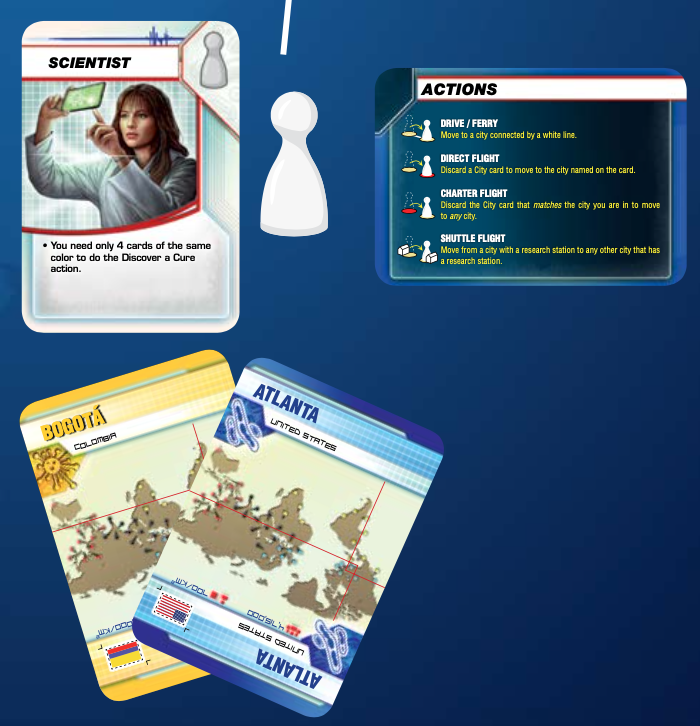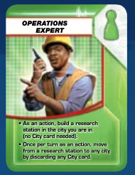 • một lần mỗi lượt, di chuyển từ một trạm nghiên cứu đến bất kỳ thành phố nào bằng cách bỏ thẻ