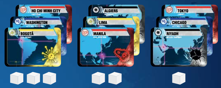 Lật thêm 3 thẻ: đặt 2 khối bệnh trên mỗi thành phố. Lật thêm 3 thẻ: đặt 1 khối bệnh vào mỗi thành phố này. (Bạn sẽ đặt tổng cộng 18 khối bệnh, mỗi khối tương ứng với màu sắc của thành phố.) Đặt 9 thẻ này úp lên trên Cọc bỏ thẻ Nhiễm trùng.