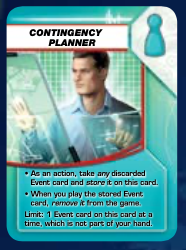 Người lập kế hoạch dự phòng có thể lấy một thẻ Sự kiện từ bất kỳ đâu trong Cọc Bỏ của Người chơi và đặt nó vào thẻ Vai trò. Mỗi lần chỉ có thể có 1 thẻ Sự kiện trên thẻ vai trò. Không được tính vào giới hạn bài trong tay.