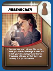 Trong Pandemic Board Game, khi thực hiện hành động Chia sẻ kiến thức, Nhà nghiên cứu có thể đưa bất kỳ thẻ Thành phố nào từ tay cô ấy cho người chơi khác trong cùng thành phố với cô ấy mà không cần thẻ phải khớp với thành phố. Việc chuyển giao phải được thực hiện từ tay cô ấy sang tay người chơi khác, nhưng nó có thể xảy ra ở cả hai lượt người chơi.
