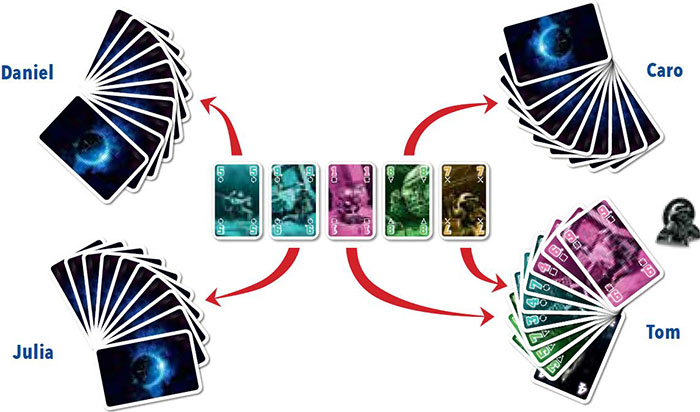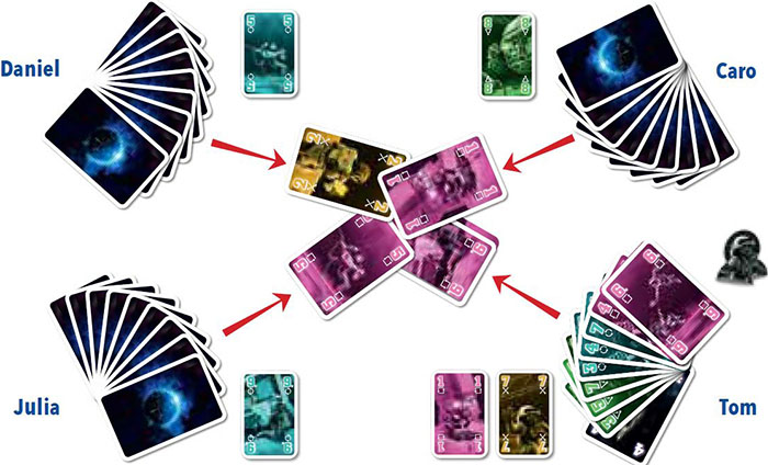 Là chỉ huy, Tom bắt đầu trò chơi. Anh ta bắt đầu trick với thẻ hồng 9 của mình và hy vọng sẽ thắng được số 1 thẻ hồng. Julia chơi thẻ hồng 5. Daniel không có bất kỳ thẻ thẻ hồng và do đó, anh ấy chơi một quân bài khác: màu vàng 2 . Caro chơi một thẻ hồng 1.