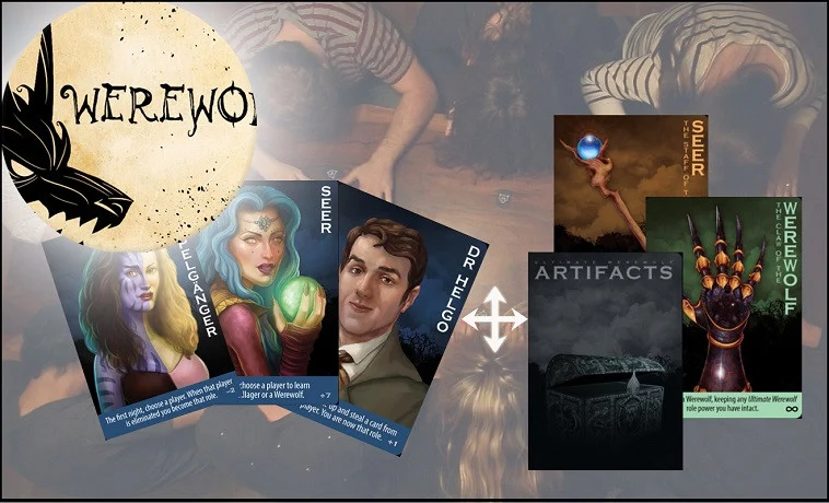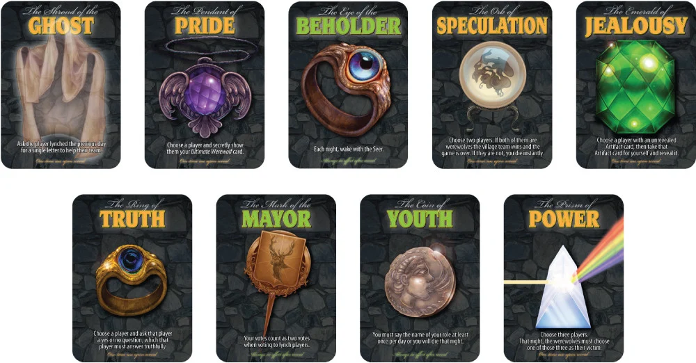 Thẻ Artifact từ bản Ma sói Artifacts là một bổ sung hoàn toàn mới cho các trò chơi Ma sói Ultimate, thêm các chiến lược và chiến thuật căng não vào trò chơi của bạn. Sự kết hợp độc đáo của thẻ Artifact đã tạo ra sự khác biệt hấp dẫn, đáng trải nghiệm trong mỗi trò chơi.