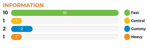 | Speed - 10/10 | Gummy - 2/10 | Heavy - 0/10 |