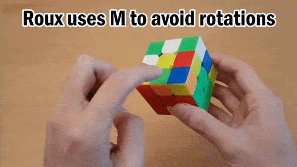 Với Roux, bạn không nhất thiết phải làm như vậy. Bạn hoàn toàn có thể tận dụng lợi thế của M-slice để ghép các cặp F2L. Thậm chí ngay cả khi tưởng như phải đảo chiều, bạn vẫn có thể làm một số trick như vậy. Chính vì thế mà Roux không cần thiết phải sử dụng đến đảo chiều cube.
