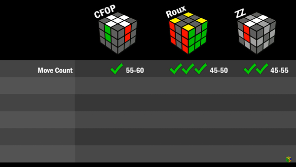 Để thực hiện CFOP cần 55 tới 60 bước. Trong khi Roux là dưới 50 và ZZ cần khoảng 45 tới 55 bước tuỳ thuộc vào việc bạn biết bao nhiêu thuật toán (tin tôi đi bạn cần phải học rất nhiều nếu như muốn giảm số bước đó xuống).