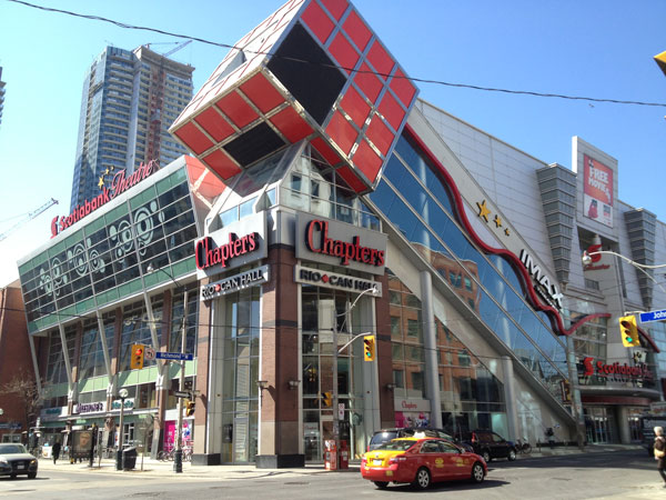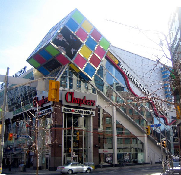 Bên ngoài nhà hát Scotiabank (Toronto) là một khối Rubik vĩ đại màu đỏ. Khối lập phương này nằm ở đầu một chiếc thang cuốn bên trong tòa nhà và một số du khách nói rằng nhìn từ bên trong khá… buồn nôn (cái này chắc phải trải nghiệm mới hiểu :D).